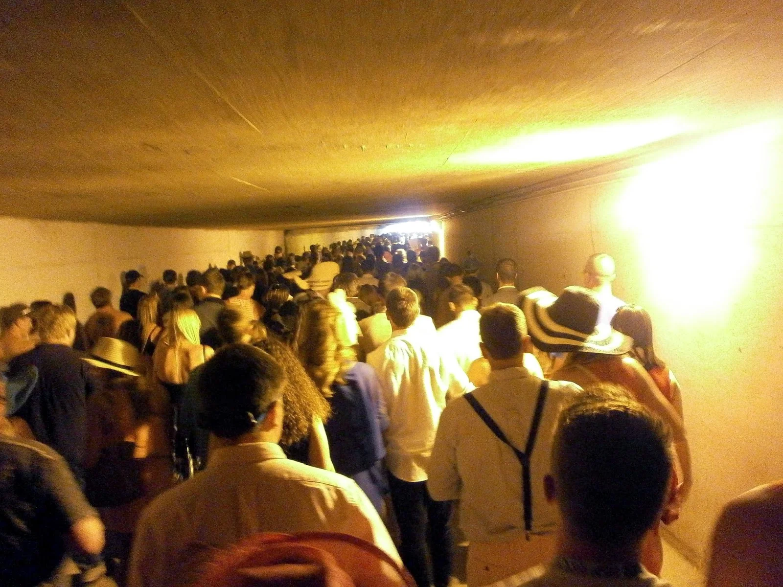 Head into the infield with your friends & hold on to them! You have to go through this tunnel, & there's a lot of people. Like a lot.